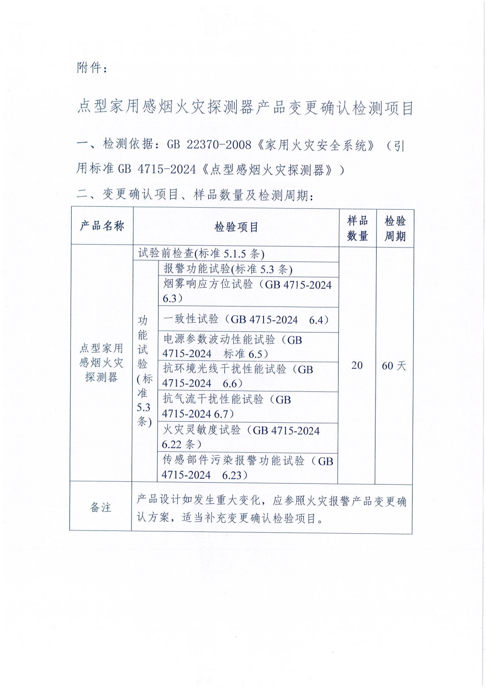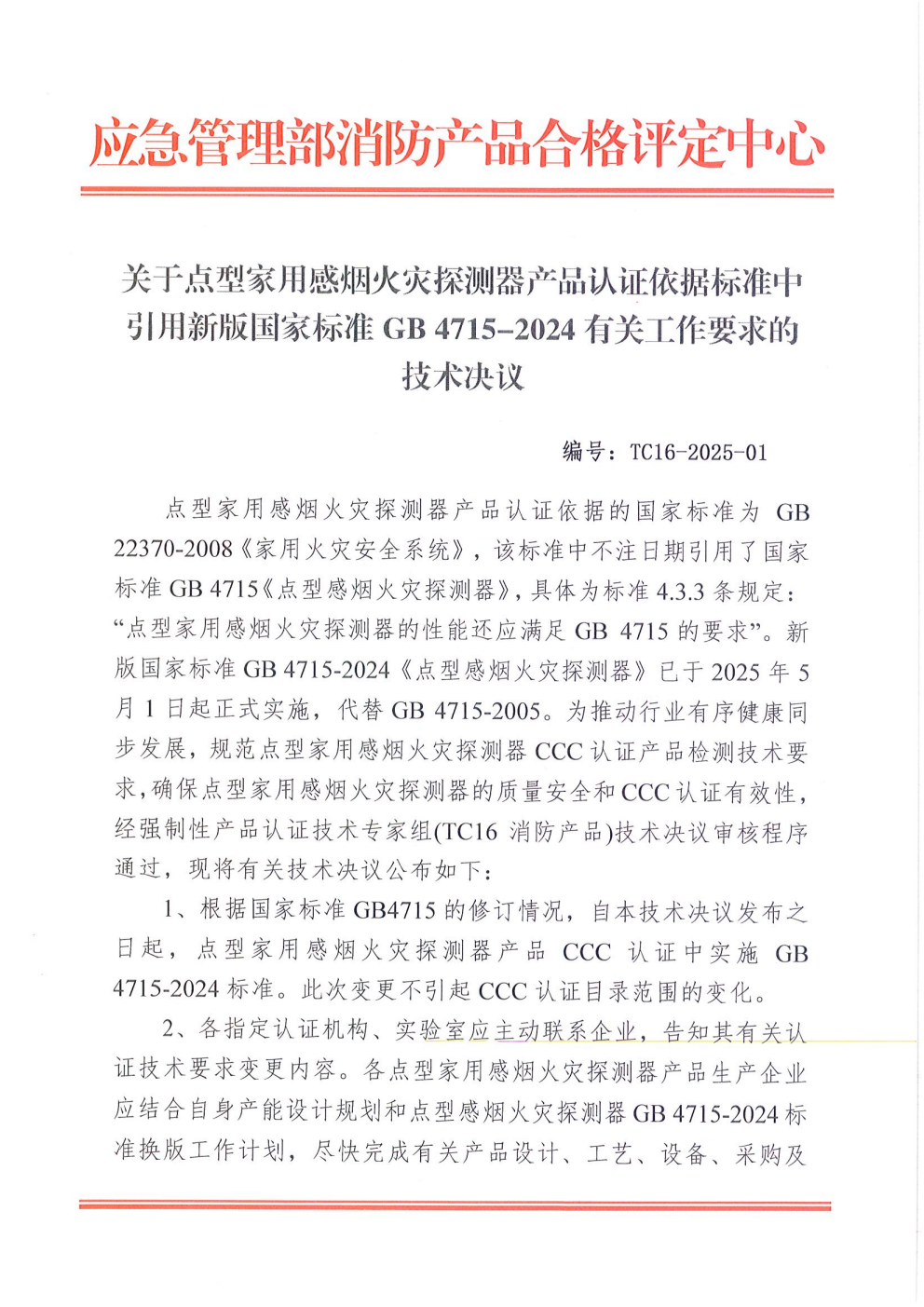 关于点型家用感烟火灾探测器产品认证依据标准中引用新版国家标准GB 4715-2024有关工作要求的技术决议