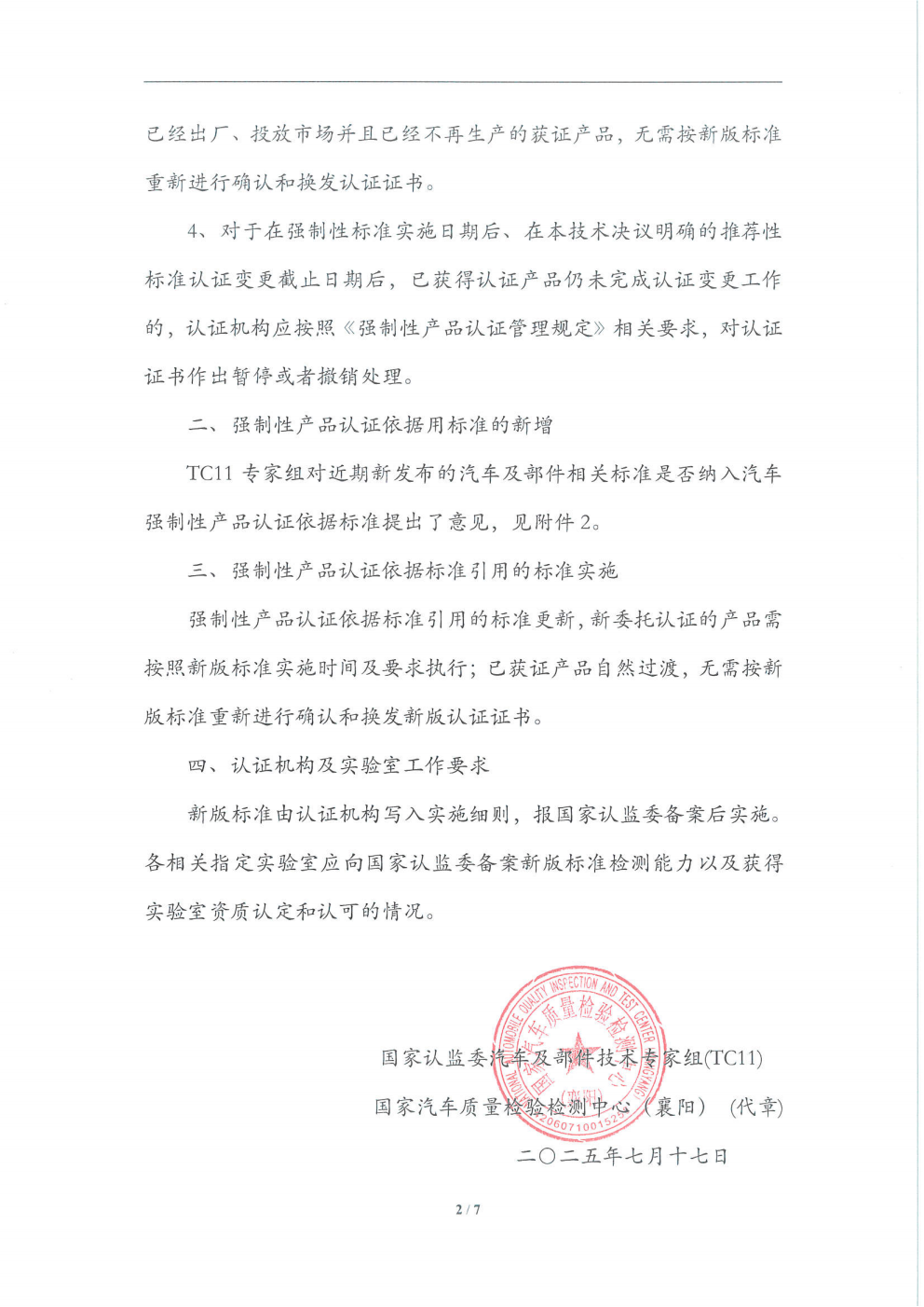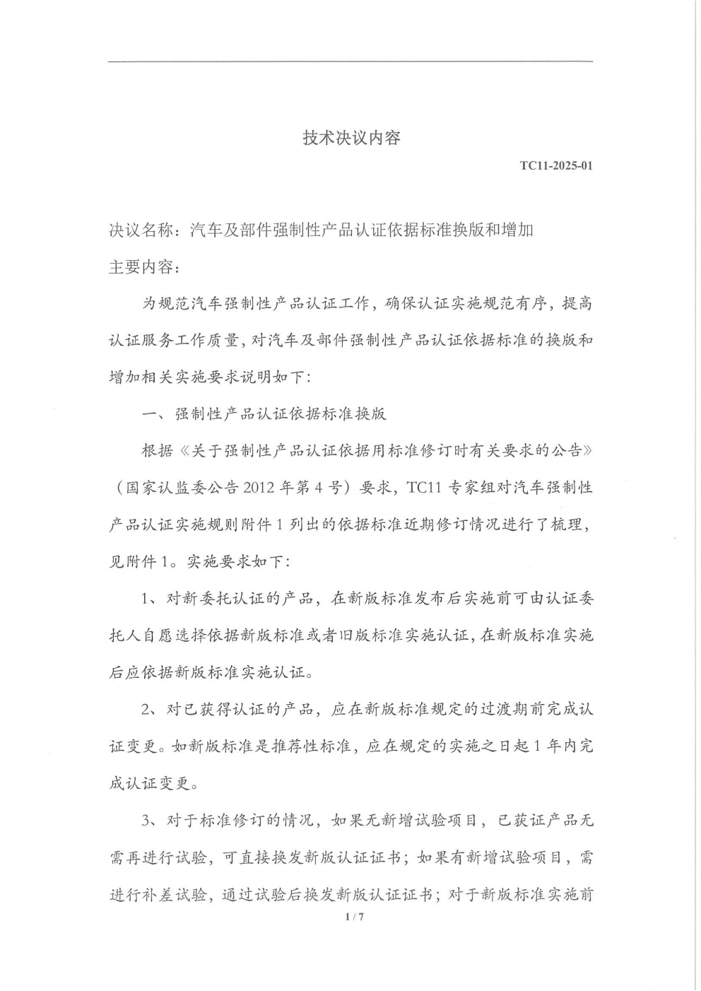 TC11-2025-01汽车及部件强制性产品认证依据标准换版和增加技术决议
